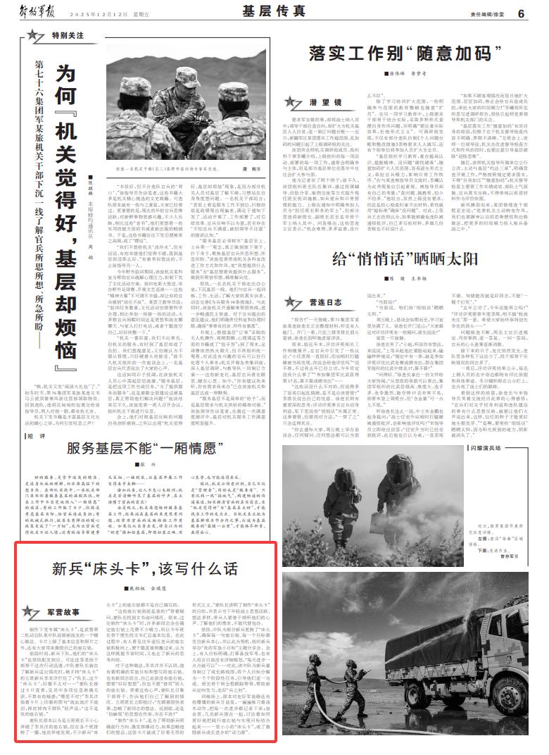 “制作‘床头卡’,是为了帮助新兵明确前行方向、激发拼搏动力,如果忽略他们的想法,这张卡片就成了好看无用的形式主义。”姜队长讲明了制作“床头卡”的目的,并表示当下年轻战士思想活跃、想法多样,带兵人要善于倾听他们的心声、了解他们的需求,不能代替包办。