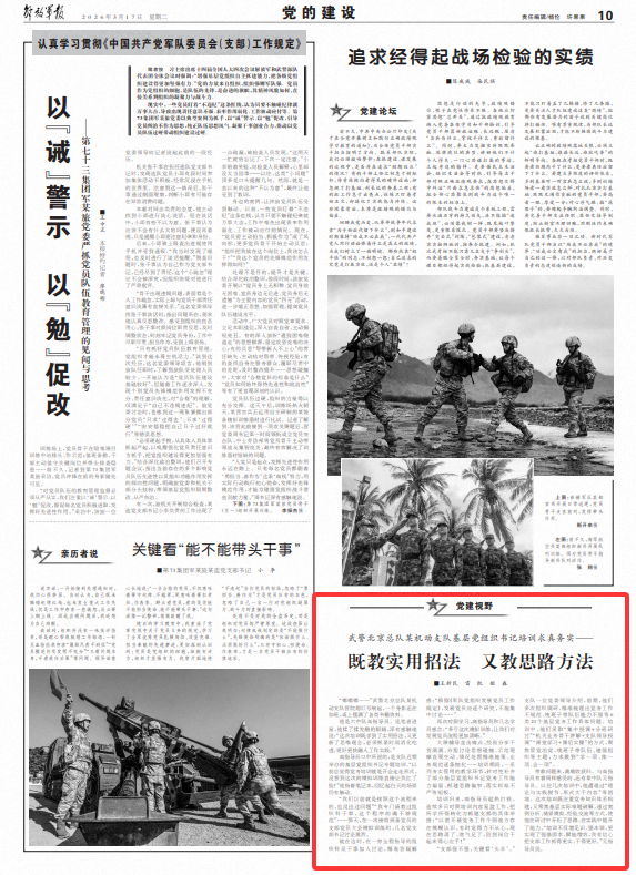 培训归来,高指导员趁热打铁,连续多日对照培训内容复盘工作,把所学所悟转化为抓建支部的具体举措:“以前开展党务工作个别地方存在模糊认识,有时觉得力不从心,现在思路清了、底气足了,回到岗位干起来得心应手!”