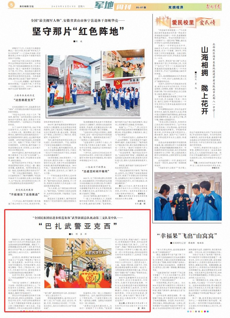 王沿明介绍,中队驻地周边社区的年轻人大多外出务工,居民多为老人、儿童。每逢少数民族、汉族节日,中队都会邀请驻地群众来部队一起过节。为帮助家庭有困难的学龄儿童,中队还组织“春蕾计划”“石榴红”等助学活动,资助15名家庭困难学生。