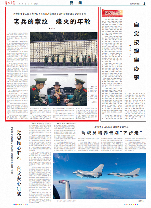 近日,武警怀化支队官兵寻访采集的93岁抗战老兵张汉奇的手印,正式嵌入中国人民抗日战争胜利受降纪念馆抗战老兵手模墙,成为第1210枚珍贵印记。
