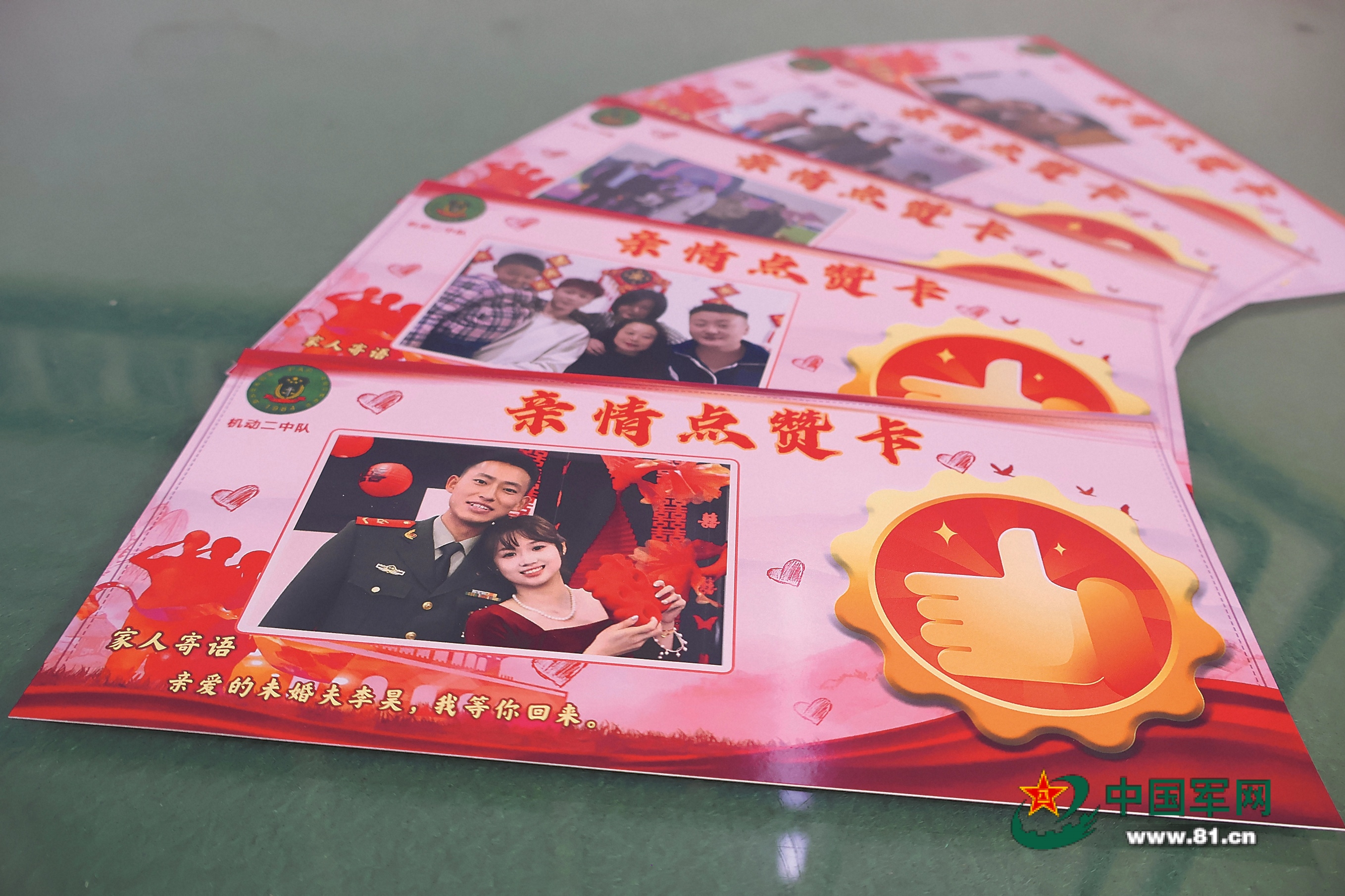 随着一段段视频陆续播放,李硕注意到,家人的嘱托虽然只有短短几句,却能深深触动官兵内心。“能否将亲人的叮嘱融入日常点滴,让这份温暖常伴官兵左右,进一步提振大家的精神状态?”他将自己的想法提了出来,并与干部骨干商议,最后决定制作“亲情点赞卡”。