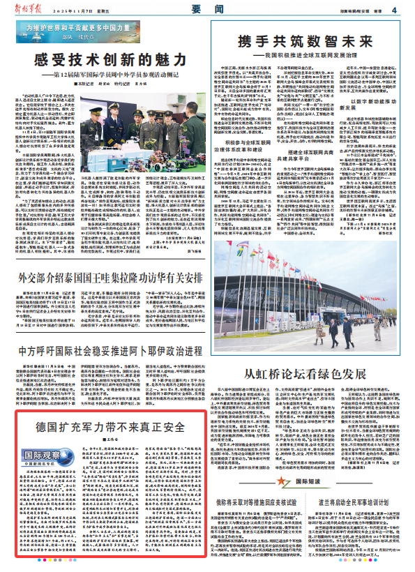 由于历史原因,国际社会高度关注德国的扩军动向。德国一方面决心打造“欧洲最强常规军队”,另一方面也在应对外部威胁与消化历史包袱之间谨慎寻找平衡。需要指出的是,军力扩张和阵营对抗带不来安全,积极建立均衡、有效、可持续的地区安全架构,才能换来欧洲真正的战略自主与长治久安。