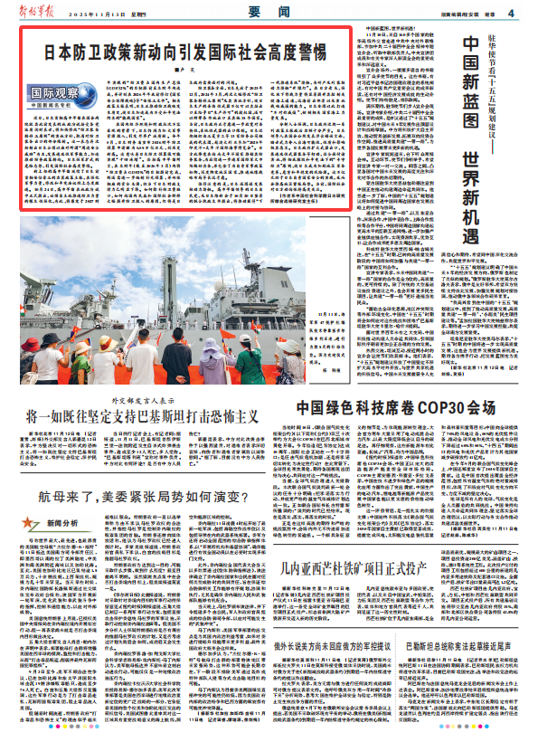 分析人士强调,日本政府近期一系列政策主张政治右倾十分严重。日本领导人在国会公然发表涉台错误言论,暗示武力介入台海可能性,性质和影响极其恶劣。日本政府扩大武器出口、发展进攻性武器装备等行动,若全面付诸实施,将彻底摧毁和平宪法下的“专守防卫”原则,使日本成为加剧地区军备竞赛、危害和平稳定的风险源。这不仅无助于日本自身国家安全的实现,反而会推高地区紧张局势。当前,国际社会对日方动向保持高度关注。