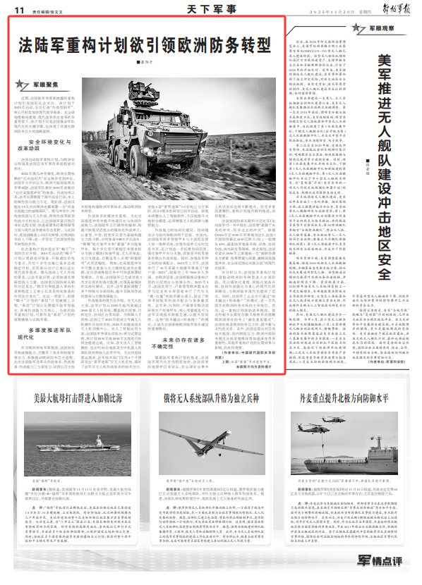 有分析认为,法国陆军重构计划有望推动欧洲防务转型进入实质阶段。其以模块化重组、智能化装备升级、协同作战强化为重心的现代化改革路径,为欧洲陆军现代化提供了范式。同时,法国军工企业亦可通过“技术输出+标准推广”的模式,进一步巩固其在欧洲防务市场的主导地位。然而,这一重构计划面临诸多挑战。前北约秘书长斯托尔滕贝格曾多次提醒欧洲国家在防务上“避免重复建设”。法国在推进欧洲防务自主时,需平衡与北约的关系。此外,法国还需应对自身技术瓶颈、国内财政压力、欧洲内部防务理念分歧及地缘局势加速演变等多重制约,其陆军重构计划的长期效果与影响,仍有待观察。