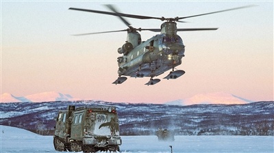 在欧洲北翼,英国海空军通过开展“发条行动”,凸显借道北极的战略布局。行动期间,英军“梅林”“野猫”“支奴干”等多型直升机进驻位于北极圈内的挪威巴尔杜福斯空军基地。