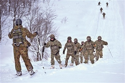 美军士兵和日本自卫队队员在“北风26”演习期间进行滑雪训练。