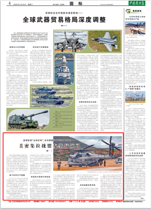 然而,长时间、多线并进的用兵模式,暴露出美军资源捉襟见肘的困境。在“双鹰”空中演习中,战略轰炸机全程缺席,F-35A等第五代战斗机参演数量寥寥,演习主力为老旧的F-16战斗机。“金色眼镜蛇”演习首次缺乏大型两栖攻击舰或船坞登陆舰等关键平台支撑,仅依靠少量小型登陆艇“维持场面”。外军专家认为,美军在同期举行的“铁拳”两栖作战演习中派出“的黎波里”号两栖攻击舰,显露出资源配置上的厚此薄彼。在航母战斗群与战略轰炸机部队均处于部署真空期、无法在印太地区形成有效战力的背景下,本轮系列演习的实际威慑效果有限。