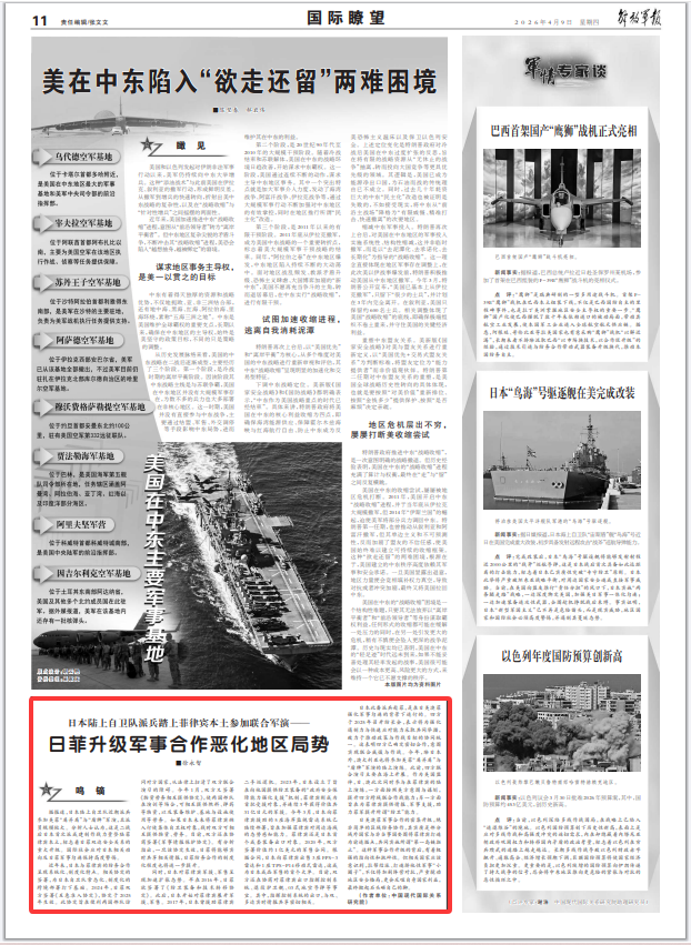 据报道,日本陆上自卫队近期派兵参加美菲“肩并肩”与“盾牌”军演,且派员规模较大。分析人士认为,这是二战后日本首次派成建制作战力量登陆菲律宾本土,标志着日菲双边安全关系的重大升级。国际社会应对日本相关动向及日菲军事勾连保持高度警惕。
