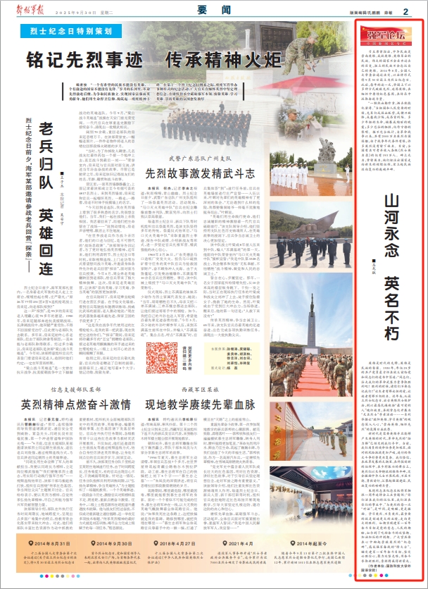 朱德同志在纪念左权将军牺牲一周年追悼会上庄重题词:“你们活在我们的记忆里,我们活在你们的事业中。”与英烈的每一次“对话”,是叩问,是唤醒,更是激励。学习英烈、不负英烈,最重要的就是创造更大的业绩,走向更大的胜利。如期实现建军一百年奋斗目标是党的意志、人民的期盼,如今到了吃劲奋斗的攻坚期、加油加压的冲刺期。广大官兵要在心中砌起崇敬英烈的“纪念碑”,高筑强军备战的“烽火台”,锚定建军一百年奋斗目标,坚定必胜信心,聚力攻坚克难,用奋斗夺取新胜利,靠拼搏赢得新荣光。