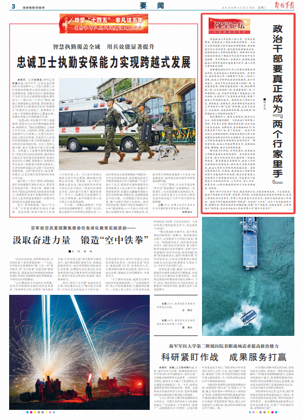 强化“两个行家里手”意识,提高领兵打仗、决战决胜的本领。习主席指出,政治干部要努力学军事、学指挥、学科技,全面提高综合素质和实际能力,政治工作要成为行家里手,军事工作也要成为行家里手,这样才能把政治工作做好。政治干部不能做训练的“旁观者”、打仗的“门外汉”,而应下功夫把练兵打仗、指挥打仗、带兵打仗的本领搞过硬,具备“坐下来能写、站起来能讲、上战场能打”的素质,真正成为政治工作和军事工作“两个行家里手”。