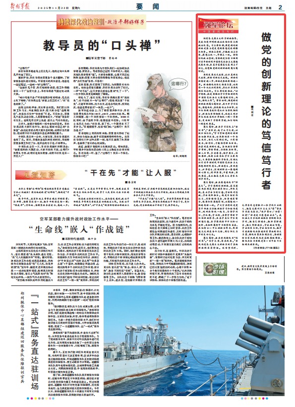 笃信笃行,应在思想内化中“淬真火”。学习党的创新理论,最深层最内在的是用以滋养初心、淬炼灵魂,真正学出坚定信念、学出绝对忠诚、学出使命担当。越是目标宏伟远大、形势错综复杂、任务艰巨繁重,越要加强思想引领,以思想统一促进行动一致。广大官兵特别是党员干部应注重把理论学习和锤炼党性、砥砺品格统一起来,坚持学而信、学而思、学而行,在常学常新中加强理论修养,在真学真信中坚定理想信念,在学思践悟中牢记初心使命,在细照笃行中不断修炼自我,在知行合一中主动担当作为,用理想之光照亮奋斗之路,用信仰之力开创美好未来。