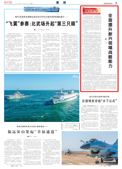 新兴领域是新质生产力和新质战斗力形成和存在的共性空间。新兴领域战略能力,关系我国经济社会高质量发展,关系国家安全和军事斗争主动。如何全面提升新兴领域战略能力?党的二十届四中全会通过的《中共中央关于制定国民经济和社会发展第十五个五年规划的建议》提出:“加快新兴领域战略能力建设,推动新质生产力同新质战斗力高效融合、双向拉动。”这为我们巩固提高一体化国家战略体系和能力、推动国防实力与经济实力同步提升,指明了方向。