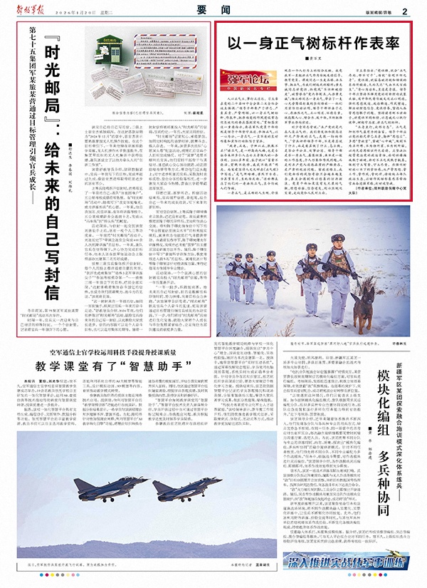 人以正气立,事行正道远。习主席在党的二十届四中全会第二次全体会议上强调:“领导干部要严于律己、严负其责、严管所辖,以一身正气树标杆、作表率,把推动党的作风建设常态化长效化的要求落到实处。”贯彻落实这一重要指示,要求军队党员干部特别是领导干部坚守正道、弘扬正气,以一心为公、一身正气、一尘不染的良好形象和实际行动取信于官兵。