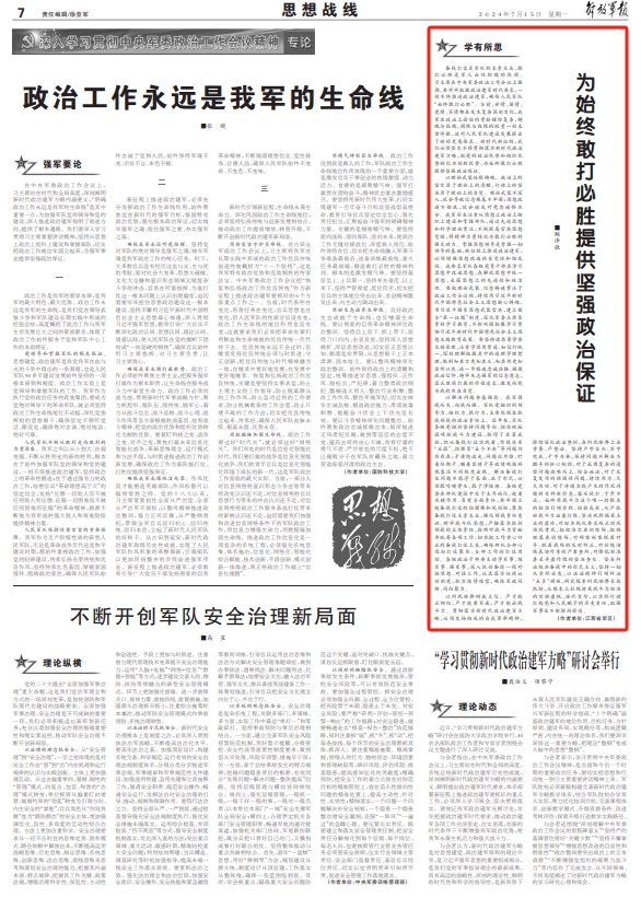 备战打仗是军队的主责主业,敢打必胜是军人血性胆魄的体现。习主席在中央军委政治工作会议上强调,要牢牢把握政治建军时代要求,一刻不停推进政治建军,确保人民军队“始终敢打必胜”。当前,世情、国情、党情、军情都在发生复杂深刻变化,我军在政治上面临的考验错综复杂,铸魂与蛀魂、固根与毁根的较量一刻未曾停歇,这对人民军队建设发展提出了新的更高要求。新时代新征程,我们必须坚定不移贯彻落实新时代政治建军方略,把党的政治优势和组织优势转化为制胜优势,为始终敢打必胜提供坚强政治保证。