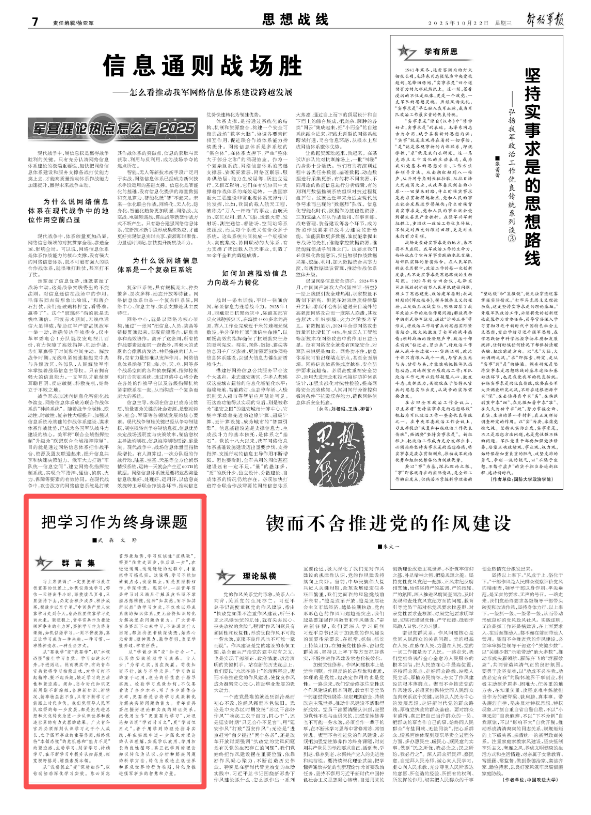 习主席强调:“一定要把学习放在很重要的位置上,如饥似渴地学习,哪怕一天挤出半小时,即使读几页书,只要坚持下去,必定会积少成多、积沙成塔,积跬步以至千里。”中国共产党人依靠学习走到今天,也必然要依靠学习走向未来。新征程上,青年官兵作为推进强军事业的生力军,要把学习作为终身课题,如饥似渴学习,一刻不停提高,真正让学习成为一种兴趣、一种习惯、一种精神追求、一种生活方式。