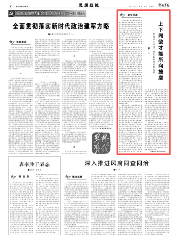 “红军中官兵伕衣着薪饷一样,白军里将校尉饮食起居不同”,这是井冈山斗争时期流传的一副对联,形象描绘了红军与国民党军官兵生活和地位的截然不同。上下同欲者胜。一路走来,人民军队之所以能攻无不克、战无不胜,很重要的一点,就在于建立了官兵一致的新型官兵关系,确保了部队团结、上下一心。在古田全军政治工作会议上,习主席把“坚持官兵一致、发扬民主”明确为我军政治工作优良传统之一,为在新的时代条件下加强部队内部关系建设指明了方向、提供了遵循。
