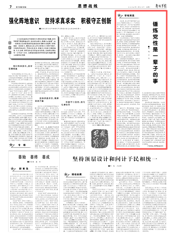 在知行合一中淬炼党性。“刀在石上磨,人在事上练。”党性修养的成色,最终要在实践中检验。守岛32年的王继才、“校长妈妈”张桂梅、义无反顾回馈大山的黄文秀……他们用行动践行誓言、坚守党性,树立起共产党人永不褪色的精神丰碑。关键时刻能否敢于负责、勇于担当,最能看出一个干部的党性和作风。新征程是充满光荣和梦想的远征,但也绝非坦途,我们难免会遇到各种风高浪急甚至惊涛骇浪的考验,必须发扬斗争精神,强化政治担当,面对大是大非敢于亮剑,面对矛盾敢于迎难而上,面对危机敢于挺身而出,面对失误敢于承担责任,面对歪风邪气敢于坚决斗争,在伟大斗争中经风雨、见世面,在火热实践中壮筋骨、长才干。要始终保持“闯”的精神、“创”的劲头、“干”的作风,主动到改革发展的主战场、维护稳定的第一线、服务群众的最前沿,把该挑的担子挑起来、该扛的责任扛起来,做到平常时候看得出来、关键时刻站得出来、危难关头豁得出来,以知重负重、攻坚克难的实际行动,不断锤炼党性、提高觉悟、提升境界。