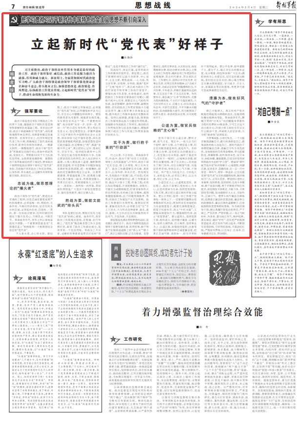 编者按 习主席指出,政治干部的表率作用本身就是最好的政治工作。政治干部形象好、威信高,政治工作说服力感召力就强,作用和威力就大。新征程上,全面贯彻新时代政治建军方略,广大政治干部特别是政治领导干部要强化使命意识和奋斗意志,带头徙木立信,加强思想改造、政治锻造、作风塑造,弘扬政治工作优良传统,立起新时代“党代表”好样子,推动生命线焕发新的生命力。