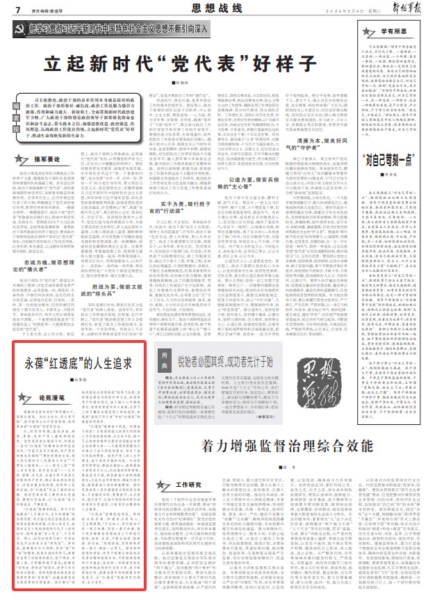 红,炽烈而明媚,象征赤诚、热情、勇敢,是共产党人最纯粹的底色。我党我军在长期奋斗中,淬炼出一系列“红透底”的精神品质和优良作风。“竹签子是竹子做的,共产党员的意志是钢铁”“要把有限的生命,投入到无限的为人民服务之中去”“不带私心搞革命,一心一意为人民”“别人有车有房,我守岛为国”……江竹筠、雷锋、谷文昌、王继才等不同历史时期的共产党员,都以革命意志的坚贞、对革命事业的热情、对党和人民的忠诚,为“红透底”作出了最好的注脚。新时代革命军人要传承红色基因、赓续红色血脉,让“红透底”成为价值追求、干事底色。