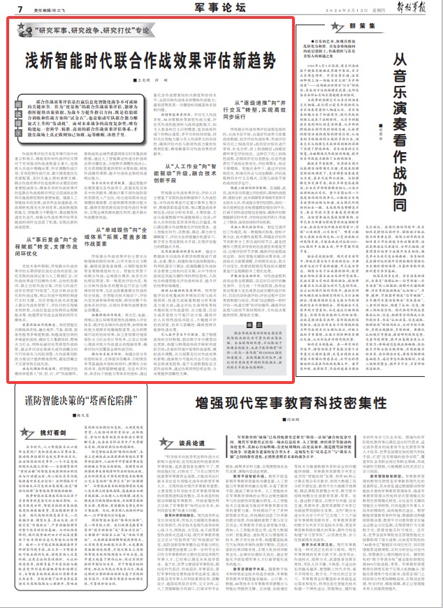 联合作战效果评估是打赢信息化智能化战争不可或缺的关键环节。作为“度量衡”的联合作战效果评估,能够为指挥提供决策依据,为战斗力提升指引方向,既是检验联合训练和作战方案的“试金石”,也是驱动军队联合能力螺旋式上升的“发动机”。面对未来战争的高度复杂性,唯有构建起一套科学、精准、高效的联合作战效果评估体系,才能在战场上真正做到知己知彼、运筹帷幄、决胜千里。
