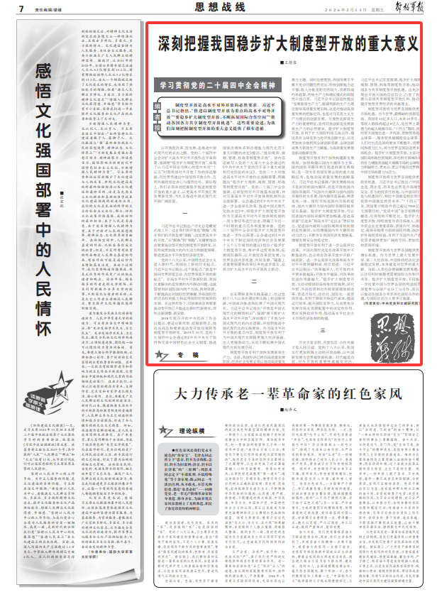 以开放促改革、促发展,是推进中国式现代化的必由之路。党的二十届四中全会对扩大高水平对外开放作出专章部署,强调要“稳步扩大制度型开放”,体现了以习近平同志为核心的党中央对“十五五”时期我国对外开放工作的深远擘画,向世界传递出中国坚持开放合作、互利共赢的坚定决心与强烈信号。新征程上,我们必须深刻把握稳步推进制度型开放的重大意义,以更高水平开放汇聚发展新优势,为扎实推进中国式现代化开辟广阔前景。