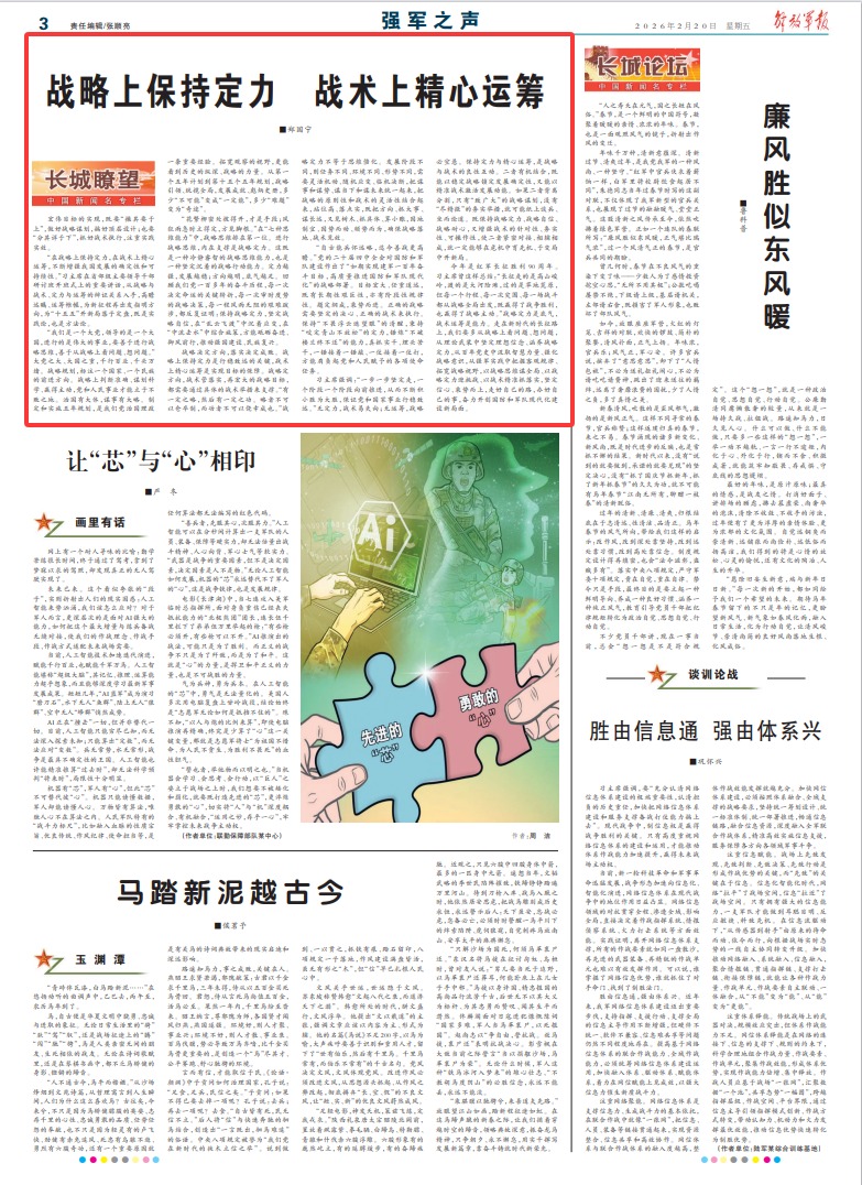 “自古能兵怀远略,迄今善战更高瞻。”党的二十届四中全会对国防和军队建设作出了“如期实现建军一百年奋斗目标,高质量推进国防和军队现代化”的战略部署。目标宏大、任重道远,既有长期性艰巨性,亦有阶段性规律性。题定纲成,乘势而进。正确的战略需要坚定的决心、正确的战术来执行。保持“不畏浮云遮望眼”的清醒,秉持“咬定青山不放松”的定力,锤炼“不破楼兰终不还”的能力,真抓实干、埋头苦干,一锤接着一锤敲、一仗接着一仗打,方能肩负起党和人民赋予的各项使命任务。