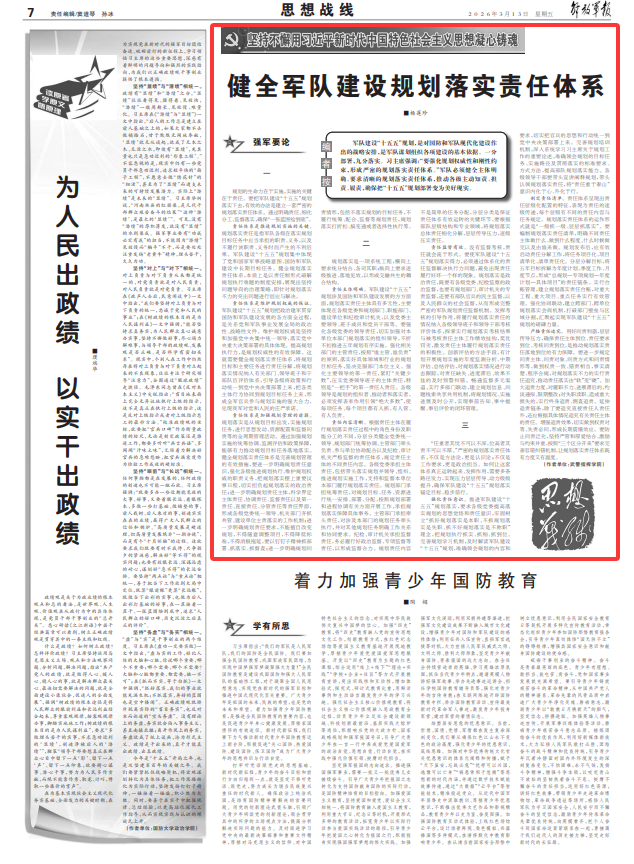 “任重者其忧不可以不深,位高者其责不可以不厚。”严密的规划落实责任体系,不仅是方法论,更是认识论;不仅是工作要求,更是政治担当。如何让这套体系真正运转起来、发挥作用,需要多条路径发力,实现压力层层传导、动力级级提升,确保军队建设“十五五”规划落实锚定目标、稳步前行。