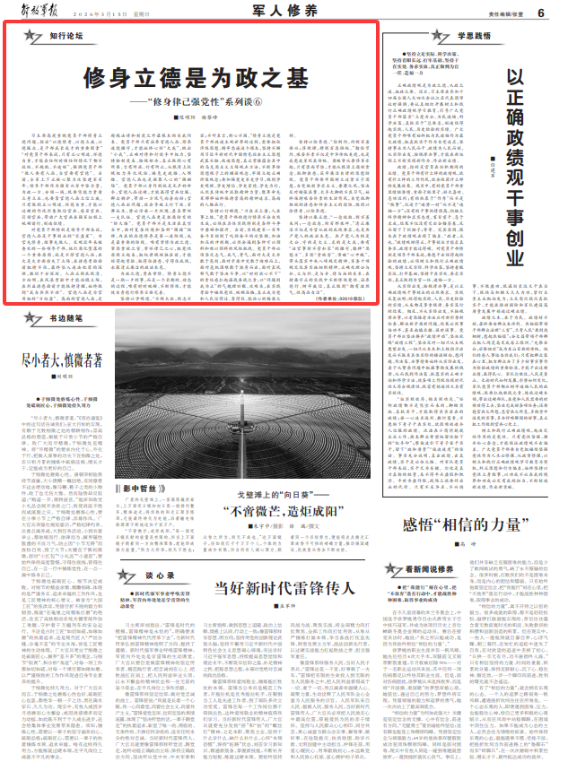 对党员干部特别是领导干部来说,官德人品是干事创业的“定盘星”。为官先修身,做事先做人。反观近年来被查处的一些领导干部,他们腐化堕落的一个重要原因,就是不修官德人品,在大是大非面前失了立场,在诱惑考验面前把持不住,最终坠入违法犯罪的深渊,教训十分深刻。人品正则底线清、方向明,在风浪考验中才能站稳立场,在利益诱惑面前才能保持清醒,始终做到“我自岿然不动”。官德人品是为官用权的“方向盘”。高尚的官德人品,是超越法律和制度之外最根本的自我约束。党员干部只有涵养官德人品、修养道德操守,才能始终心怀“大我”、跳出“小我”,正确对待和行使手中权力,坚持按制度来、按规矩办,真正做到心有所畏、言有所戒、行有所止,从根源上杜绝权力异化风险,避免走歧路、入邪路。官德人品也是凝聚人心的“强磁场”。党员干部以身作则就是无声的命令,官德人品过硬,才能赢得官兵信服、群众拥护,带动一方风气向善向好;官德人品出问题,就会导致上行下效、百弊丛生,势必污染一片环境,甚至带坏一支队伍。官德人品更是拒腐防变的“防火墙”。党员干部不是生活在真空当中,面对复杂环境和各种“围猎”陷阱,内在的品德修养是第一道防线,也是最重要的防线。唯有常修为政之德、常思贪欲之害、常怀律己之心,把党性原则立起来,把纪律规矩挺在前,才能经得起考验、抵得住诱惑、守得住底线,永葆清正廉洁的政治本色。