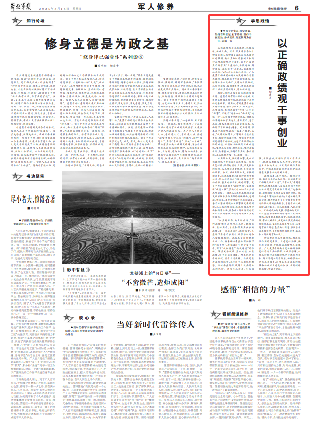 政绩之本,在于为民。政绩好不好,最终要由群众来评判。焦裕禄带领干部群众治理“三害”,兰考人民“看到泡桐树,想起焦裕禄”;谷文昌带领干部群众把人间荒岛变成海上绿洲,“先祭谷公,后祭祖宗”成为东山百姓的传统。他们的感人事迹告诉我们:只有把群众装在心里,把为群众办了多少好事实事作为检验政绩的重要标准,才能干出过硬业绩,赢得民心。军队打胜仗,人民是靠山。无论时代如何发展,形势如何变化,军队党员干部都应树牢造福人民的政绩观,既要扛起胜战之责,练就过硬本领,带出过硬部队,在党和人民需要的时候顶得上去,坚决完成好各项任务;还要想官兵之所想,急官兵之所急,多做雪中送炭的实事,多办纾难解困的好事,真正把工作做到官兵心坎上。