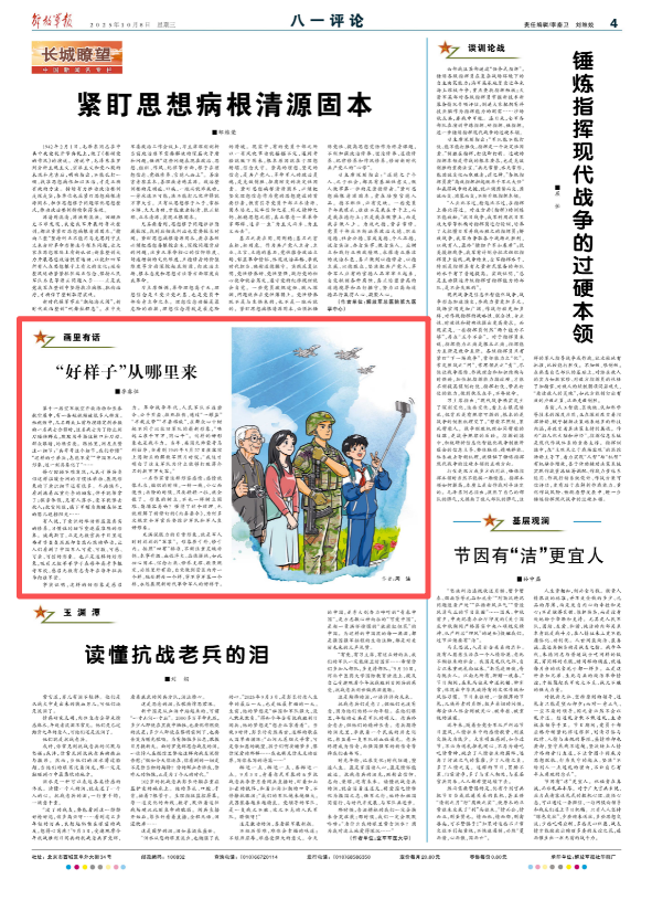 充满说服力的日常形象,就是军人时时刻刻的“军装”。形象展于外,修于内。按照“四有”标准,不断注重灵魂补钙、本事升级、血性淬火、品德提纯,如此初心固本、信念打底、修养支撑、敬畏规定,必然里外有面,自觉做到营区内外一个样,独处群处一个样,穿不穿军装一个样,永远展现新时代革命军人的好样子。