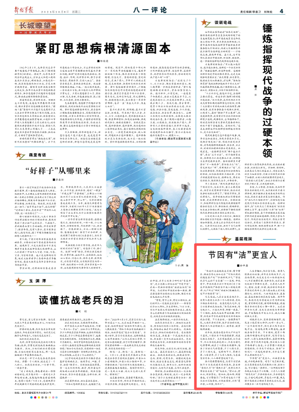 节因有“洁”更宜人。祝福贵在真诚,而非礼品丰厚。对于广大官兵来说,应力戒请客送礼式的投机心理、捷径心态,可以通过一条微信、一句问候向领导和战友们送上节日祝福。只有人人坚持“绿色交往”,少些迎来送往,多些思想交流;少些吃喝应酬,多些关心祝愿,战友情才能绽放出绚丽多姿的友谊之花,进而催生出一往无前的战斗力。
