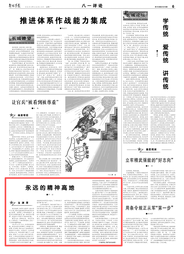 一个人的脊梁,不是骨头,而是灵魂;一支军队的支柱,不是武器,而是精神。毛泽东同志评价抗美援朝战争时曾说:“志愿军打败了美国佬,靠的是一股气,美军不行,钢多气少。”气为兵神,勇为兵本。气,指的就是军人的战斗精神。我军历来是打精气神的,以敢打敢拼闻名于世。从万里长征的“三军过后尽开颜”,到抗日战争的“驱逐倭儿共一樽”,到解放战争的“天翻地覆慨而慷”,再到抗美援朝的“击溃强敌奏凯歌”,一场场以弱胜强的战斗,靠的就是“压倒一切敌人,而决不被敌人所屈服”的精气神。