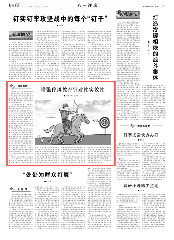 作风建设永远在路上,作风教育常抓不懈。作风问题表现多样、成因复杂,有主要矛盾和矛盾的主要方面,也有次要矛盾和矛盾的次要方面。作风教育作为解决作风问题的重要措施,必须坚持从实际出发,找准靶子、有的放矢,什么问题突出就着重解决什么问题,什么情况紧迫就抓紧研究,才能让教育取得实效。如果“眉毛胡子一把抓”,那么问题就会被掩盖。只有将精准的“靶向施教”和务实的“成效评估”结合起来,作风教育才能真正触及灵魂、直击要害。
