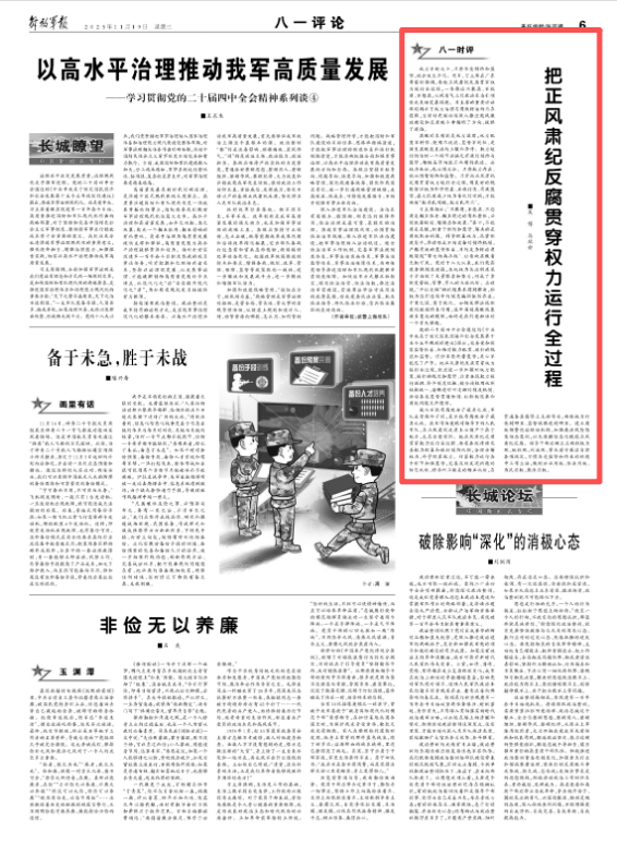 党内不能有腐败分子藏身之地,军队是拿枪杆子的,更不能有腐败分子藏身之地。我军作为党绝对领导下的人民军队,在正风肃纪反腐上必须严于高于地方,走在全党前列。把正风肃纪反腐贯穿权力运行全过程,要求各级持续完善权力配置和运行制约机制,合理分解权力,科学配置权力。盯紧权力运行各个环节加强监督,完善及时发现问题的防范机制、精准纠正偏差的矫正机制,在贯通各类监督上主动作为,确保权力行使到哪里、监督就跟进到哪里。建立腐败预警惩治联动机制,加强廉洁风险隐患动态监测,以大数据信息化赋能正风肃纪反腐。领导干部应树立正确的权力观、地位观、利益观,带头遵守廉洁自律各项规定,习惯在受监督和约束的环境中工作生活,做到公正用权、依法用权、为民用权、廉洁用权。