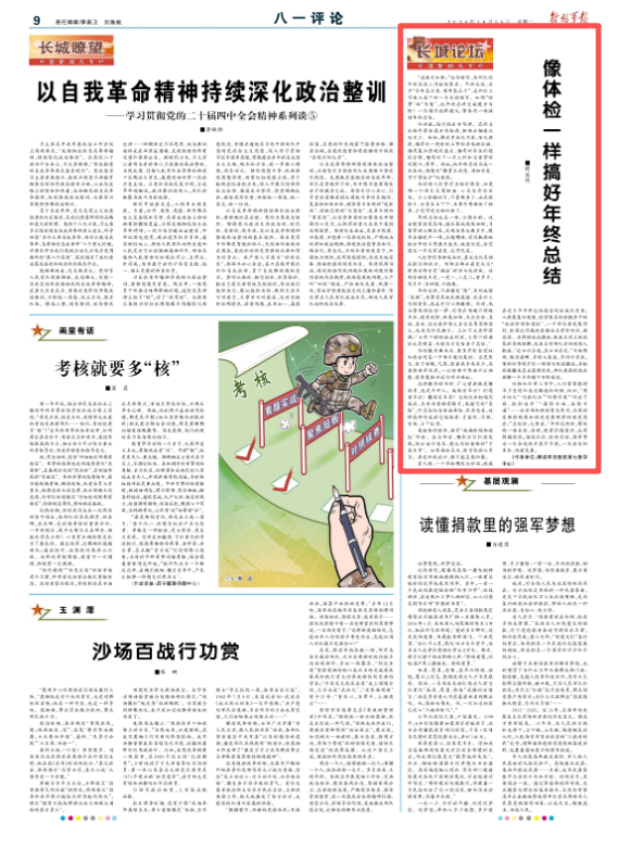 “温故而知新。”这段时间,各部队的年终总结工作陆续展开。年终总结,关乎“今年怎么看,明年怎么干”,是部队工作承上启下的一个关键环节。如何“经事”而“长智”,把年终总结变成进步台阶?一位领导这样建议:像体检一样搞好年终总结。