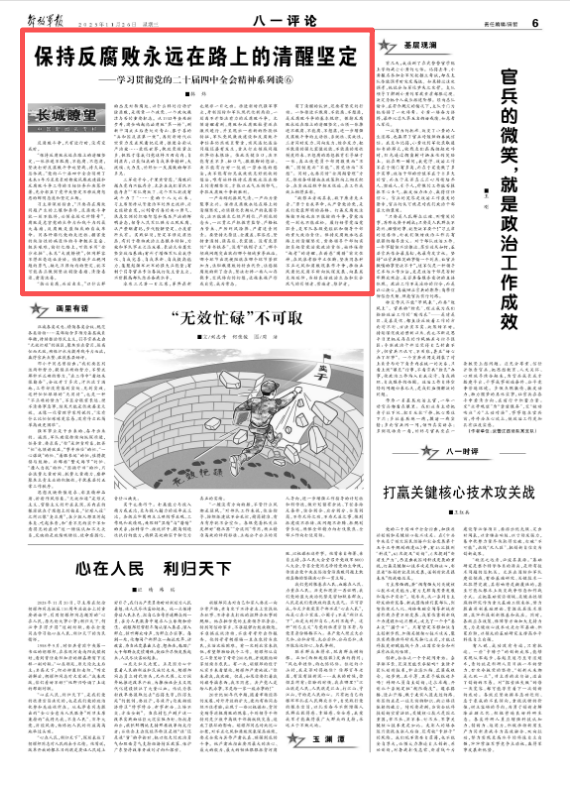 三军受号令,千里肃雷霆。“腐败问题在党内不能存身,尤其在我们军队不能存身”“军队腐败了,这个军队就没有战斗力了”……党的十八大以来,习主席坚持从管党治军的历史规律、历史经验出发,以刮骨疗毒的决心勇气、扶危定倾的胆略智慧和高压严治的鲜明姿态,领导人民军队强力正风反腐、从严整纲肃纪,步伐铿锵坚定、力度前所未有。实践证明,坚定不移反腐惩恶,有利于推动政治生态根本好转,为党和军队事业长远发展、长治久安奠定坚实政治基础;有利于增强军队自我净化、自我完善、自我革新、自我提高能力,集聚起强军兴军的强大正能量;有利于引导官兵专注备战打仗主责主业,不断提高部队练兵备战水平。