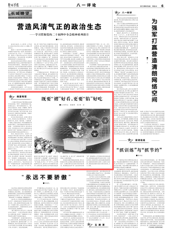 一位教导员谈起开展思想政治教育体会时说:“评价一堂教育课好不好,就像包包子,‘褶’好看能吸引人,‘馅’好吃才感觉香。”他进一步解释,“褶”代表形式,好的形式和载体能让美味入口时平添几分欢愉;“馅”代表内容,究竟味道如何,关键还是得看内核。话语朴素,比喻形象,发人深思。