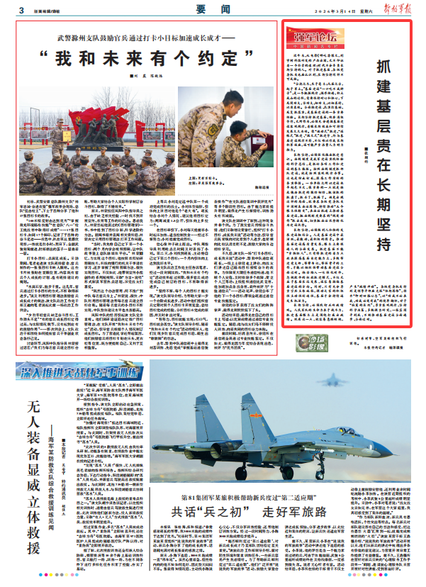 长期坚持,必须做到人和物的发展建设相结合。人是基层建设中最活跃、最能动、最积极的因素。推动基层建设高质量发展,根本上要促进人的全面发展。抓建基层不能“重物轻人”,只有将抓建的着力点放在提高基层自建能力上,多做帮建党支部、帮带书记、帮强骨干的工作,才能以组织强带动基层建设全面过硬。倘若陷入一味强化硬件、忽视软件的粗放抓建模式,不仅无益于基层长远发展,还容易搞偏基层建设的方向。同时,只有充分尊重官兵主体地位,调动大家的积极性主动性创造性,基层才会持续迸发生机活力。