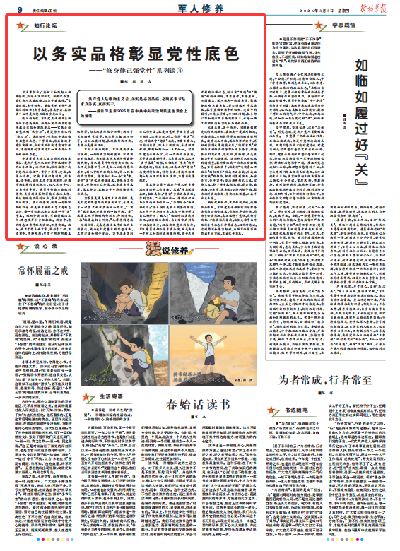 军人生来为战胜。军队是要准备打仗的,一切偏离实战的虚功、脱离实际的假把式,都可能在未来战场付出惨痛代价。军队党员干部的务实品格,从来不是抽象口号,而是融入血脉的党性原则、刻入骨髓的胜战本领、铸入肌体的严实作风。务实核心在一个“实”字,要将“实”内化为价值追求、固化为工作标准、升华为律己要求,就要在实事求是、求真务实、真抓实干中持续擦亮党性底色。