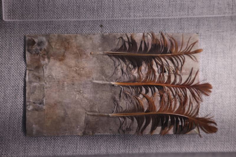 ▲北京焦庄户地道战遗址纪念馆展出的一封“鸡毛信”。信纸上贴一根鸡毛、两根鸡毛、三根鸡毛,分别代表不同的紧急程度,用于及时向组织传递信息。 资料图片