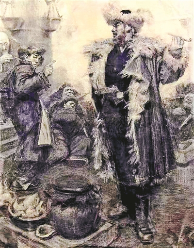 ▲杨子荣舌战小炉匠(插图) 孙滋溪作 外文出版社《林海雪原》