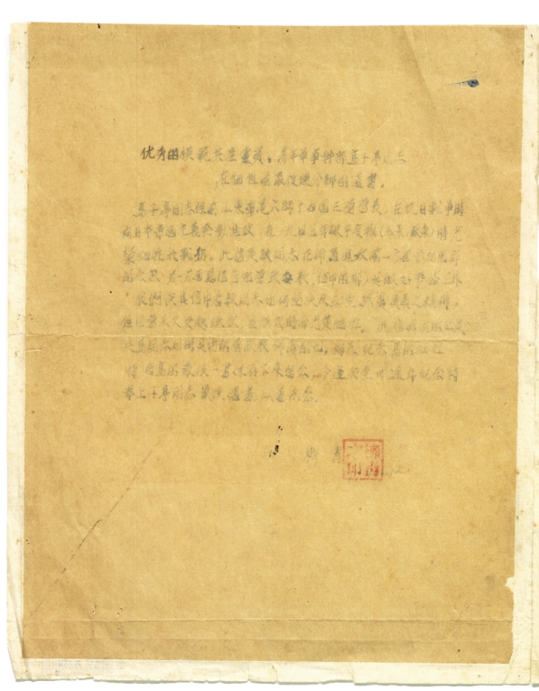 9月9日,在向平度城发起总攻前的作战部署会上,胶东军区司令员许世友命八路军组成东、西两个梯队,从东、西关对攻,以西关为主,以钳形攻势打击敌人。其中,胶东军区第14团3营营长高子亭负责率队攻打南门,发展纵深战斗。接到紧急作战命令的高子亭,立刻向营里传达和落实具体作战指示。他在会议上奋笔疾书,给教导员柳青写下了这封战地信件。信件短短百余字,对战役的战术安排、地形侦察、兵力部署、后勤安排、总攻时间等问题进行了详细部署。