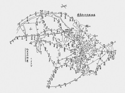 在中国国家博物馆,收藏着一张纸质小幅地图,长43.5厘米,宽41.5厘米。地图名称是一行繁体小字“灌兴全之间路线图”,左下角落款的制图单位为一列竖排繁体小字“红星司令部制”,时间为“十一月廿八日”。这是90多年前的1934年中央红军在长征途中抢渡湘江时使用的地图,上面标画着广西灌阳、兴安、全州三县之间的山地、隘口和道路,用双线代表大路,单线代表小路,并注明了各要点之间的距离。这幅泛黄的地图上斑驳的印迹默默诉说着湘江血战的往事。