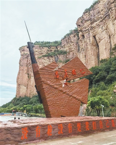 ▲群峰之间的黄崖洞文化景区大型雕塑,主体状如一面猎猎飘扬的红旗。 徐中煜摄