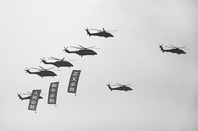 ▲在纪念中国人民抗日战争暨世界反法西斯战争胜利80周年大会上,空中护旗梯队接受检阅。 新华社发