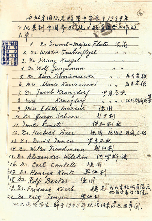 解放军档案馆曾通过社会征集,收到一份特别的档案,标题是《西班牙国际志愿军中军医于1939年分批来到中国参加抗日战争医务工作的名单》。档案记录了20名外国军医名字,且都标注了国籍。