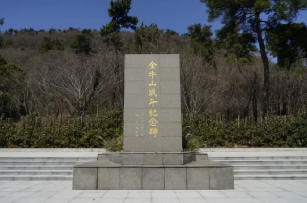 “新四军,真正强,抗战建国的好榜样,金牛山上又打了大胜仗,布下了天罗和地网,杀得鬼子汉奸没处藏,势如破竹多亏了梅花桩。杀伤他,四五百,活捉他,几十双,胜利品也挑它几十筐。扬州的鬼子泪汪汪,汪精卫也大着慌……”这首回响了80余年的铿锵战歌《金牛山上打胜仗》,正是新四军在金牛山打败日寇的真实写照。为缅怀英烈、激励后代,当地政府立碑纪念,“金牛山战斗纪念碑”八个大字苍劲雄浑,熠熠生辉。