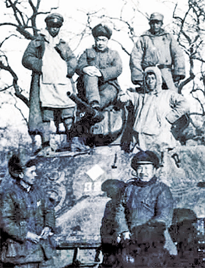 ▲陈毅等我军指战员在鲁南战役中缴获的美制坦克前留影。