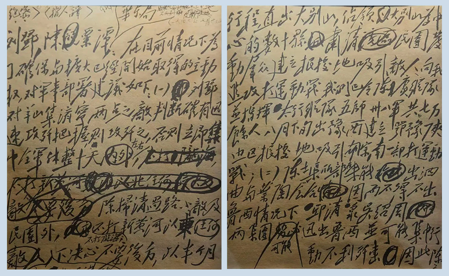▲1947年7月23日,毛泽东致刘伯承、邓小平、陈毅、粟裕、谭震林并华东局的电报。 (复制件,展陈于南京渡江胜利纪念馆)