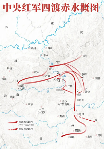 这“一撤、二打、三诱、四走”, 环环相扣如棋局推演,步步惊心似刀尖起舞。每一次渡河,都是对战场态势的敏锐回应;每一次转战,皆彰显中央红军临危不惧、战天斗地的精神。如果把四渡赤水战役比作一场大戏的话,那么可以说,“一渡”是破题开局,“二渡”是转折发展,“三渡”是谋势高潮,“四渡”是收官突围。